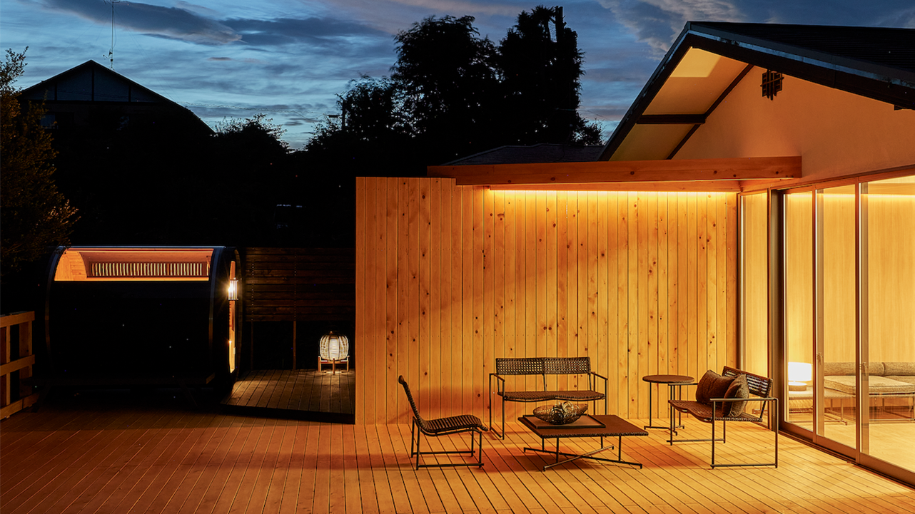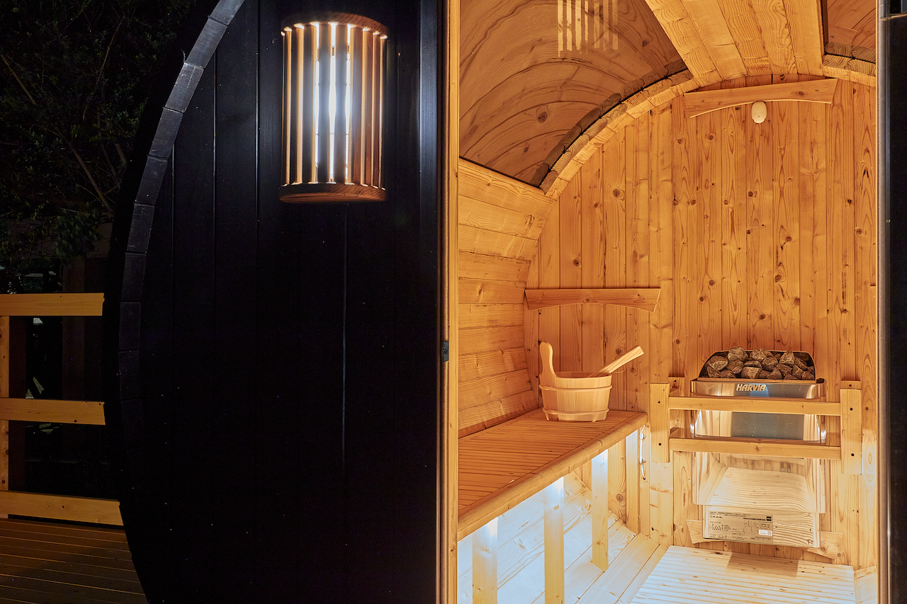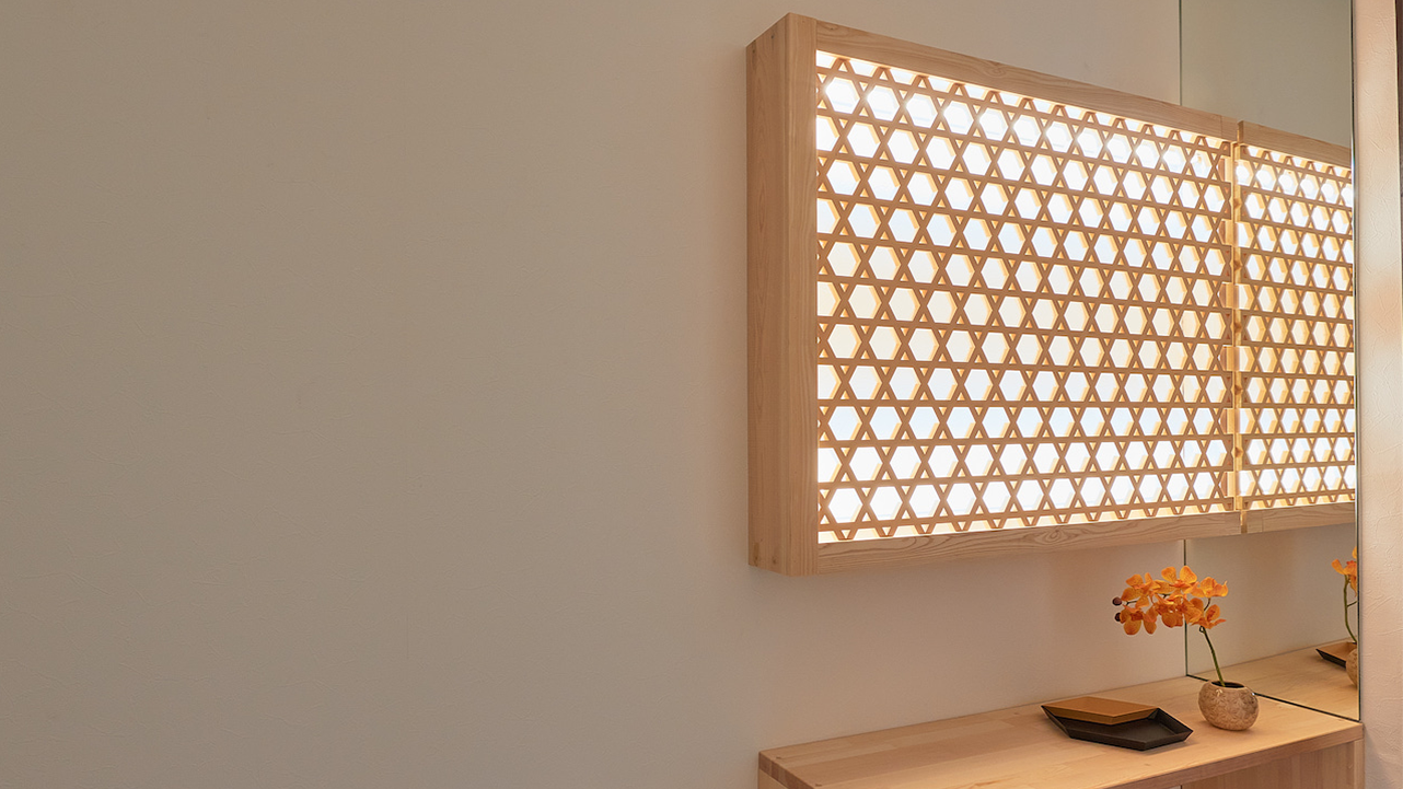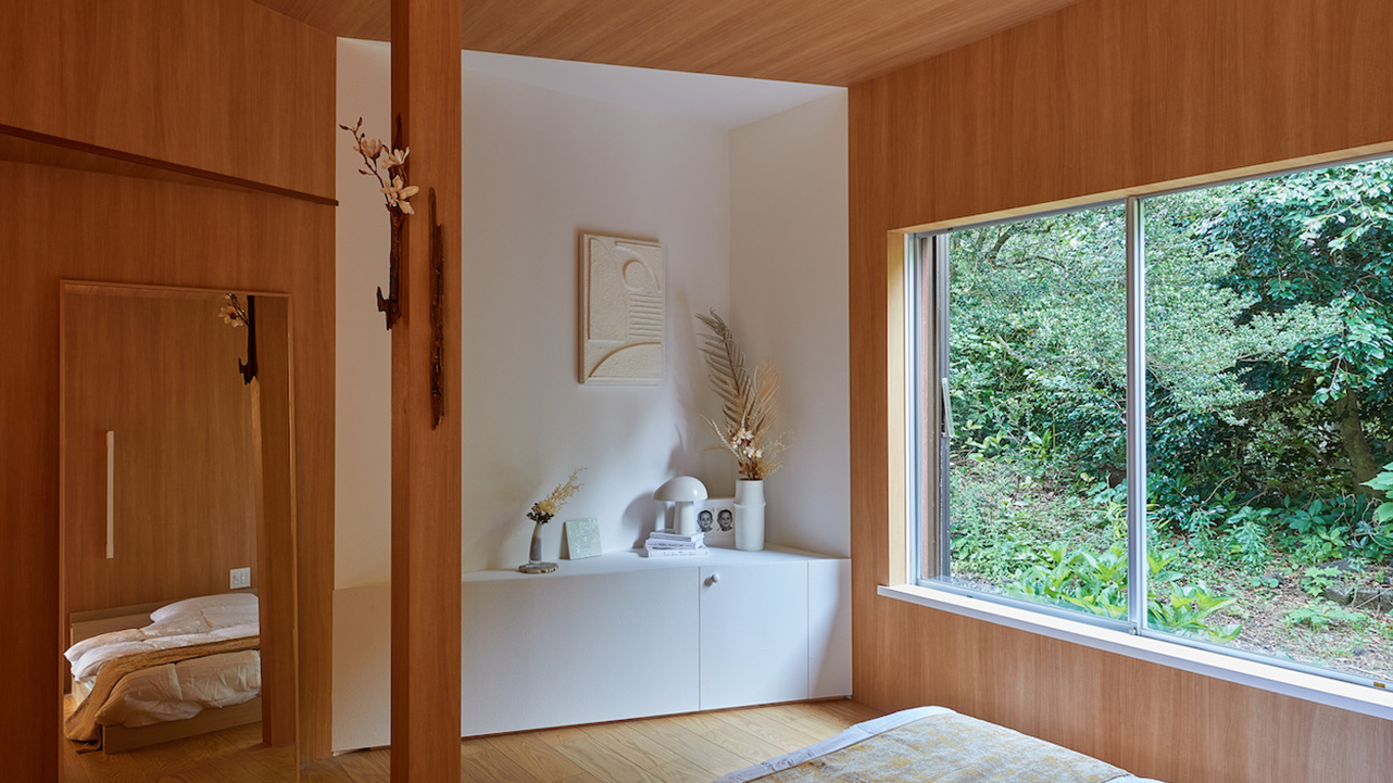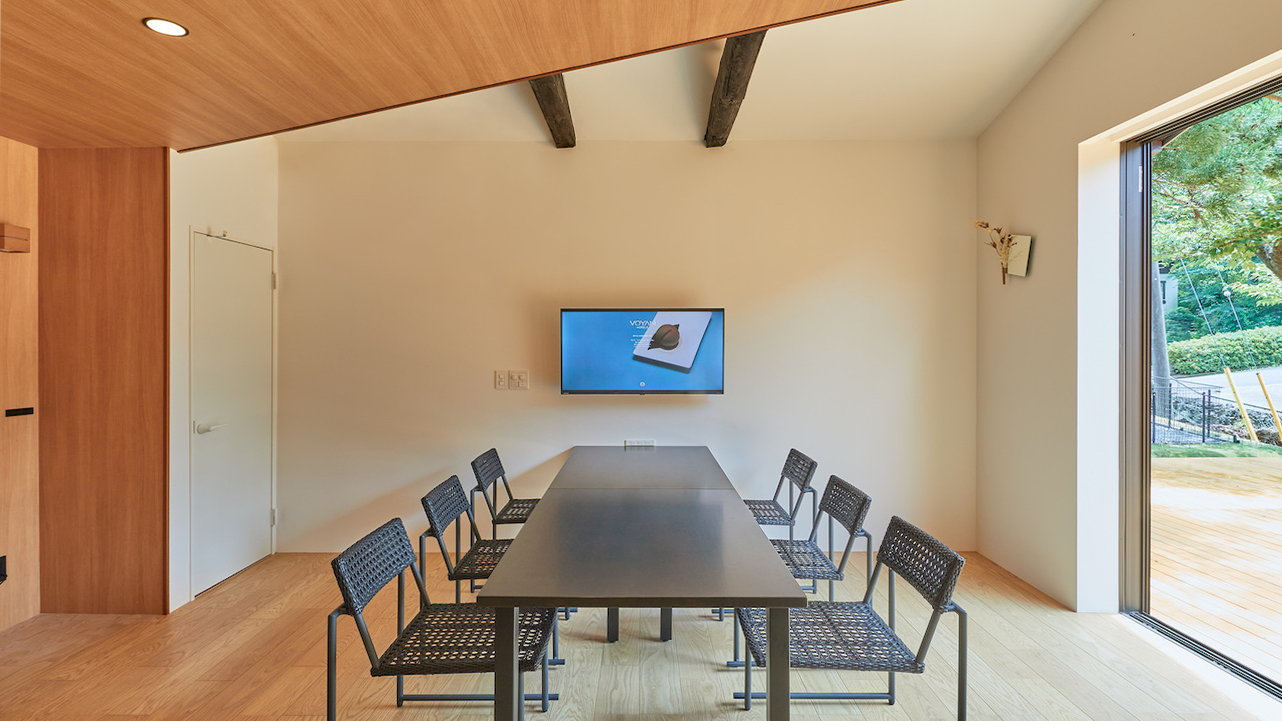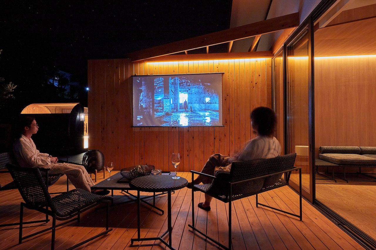 「VOYAN RESORT 伊豆MADOKA」 屋内/外に囚われない素材の切り替えがそれぞれの境界を曖昧にし 非日常的な自然との一体感を悠々と演出。 中外問わずに 明暗の色味で切り分けたエリアは暮らしの感情の起伏を表し、 活発な場と、落ち着きのある場を意図的に作り出します。